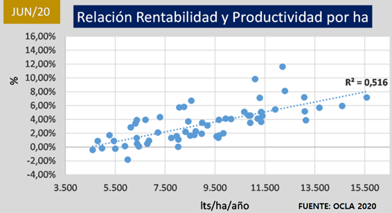 Antes que nada me gustaría describir de manera sintética la importancia de la productividad y por qué debemos mejorarla. Uno de los principales argumentos es que la unidad productiva tierra es cada vez más limitante y hay más competencia por su uso, sobre todo en los tambos donde la aptitud de uso debería ser agrícola. Por otro lado, no es novedoso que la actividad tambera como muchas otras tienen altos y bajos relacionados con problemas macroeconómicos y tomando como fuente un trabajo de la revista Márgenes agropecuarios, aquellos tambos con mayores productividades siempre tienen mayor resultado neto que los de menor productividad. Por último un trabajo de OCLA muestra una alta correlación entre la productividad por ha y la rentabilidad de un tambo.